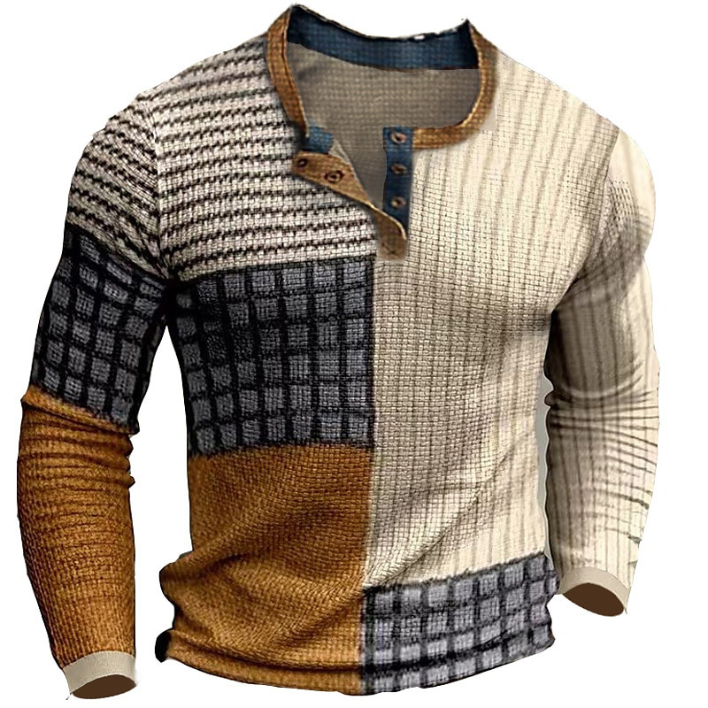 Men's Henley T-shirt Vintage Chic 3d Print Color Block Festival Holiday Plaid Striped Outdoor Long Sleeve Top
