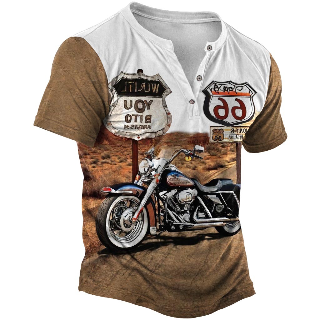 Men's Vintage Route 66 Chic Eagle Motorcycle Color Block Print Henley Short Sleeve T-shirt