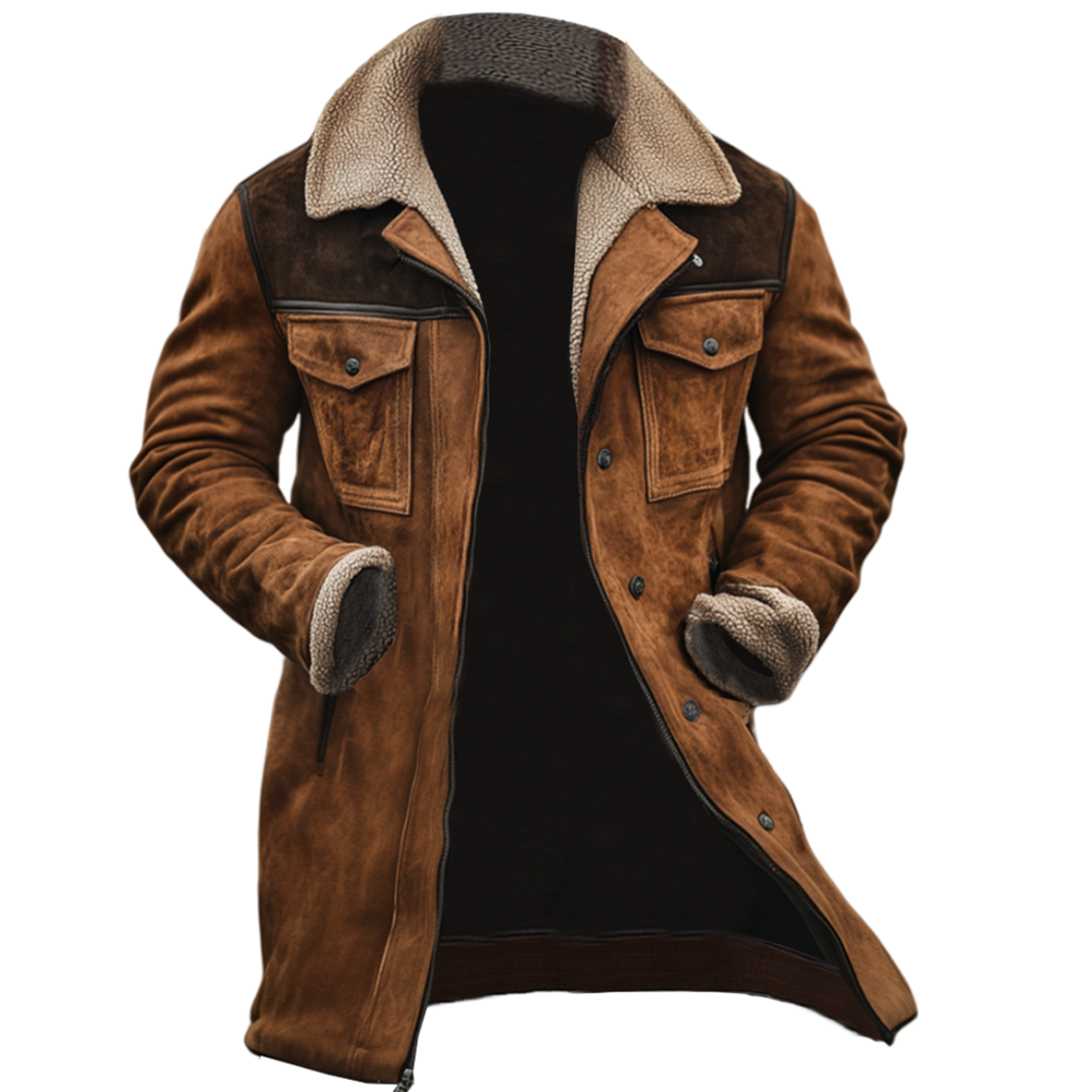 Men's Vintage Suede Patchwork Chic Lamb Fleece Multi-pocket Reverse Collar Outdoor Jacket Coat